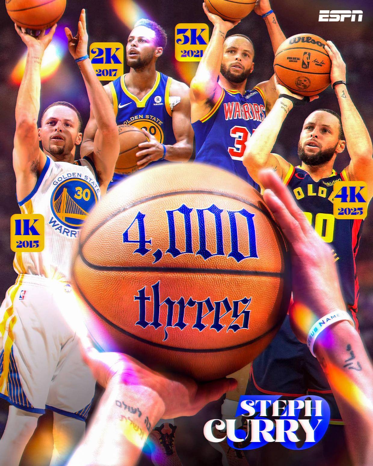 历史第一人!库里生日夜命中生涯第4000颗三分